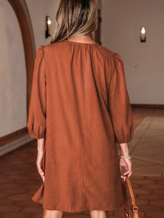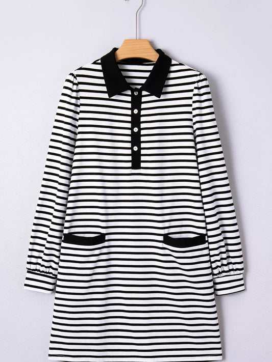Stripe Buttoned Front Collared Long Sleeve T Shirt Dress with Pockets