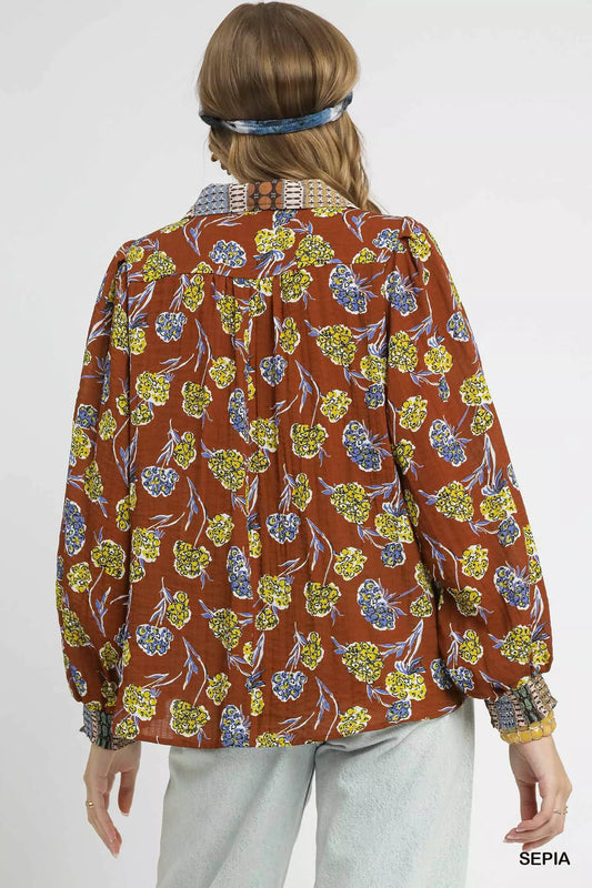 Umgee Floral Print Collar Blouse
