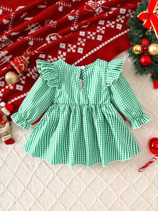 Children's Christmas Santa Embroidered Gingham One-Piece Bodysuit Dress