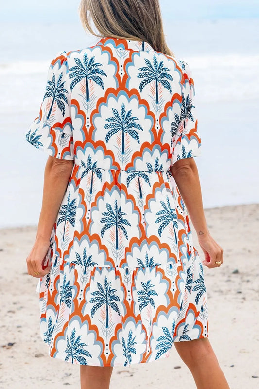 Contrast Palm Tree Printed Short Sleeve Flowy Dress