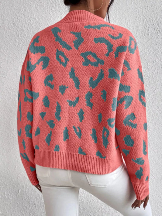 Leopard Bow Decor Split Cuff Contrast Trim Sweater