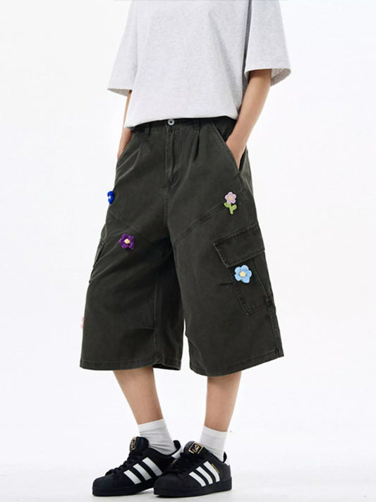 Men's Floral Appliqued Wide-Leg Cargo Shorts