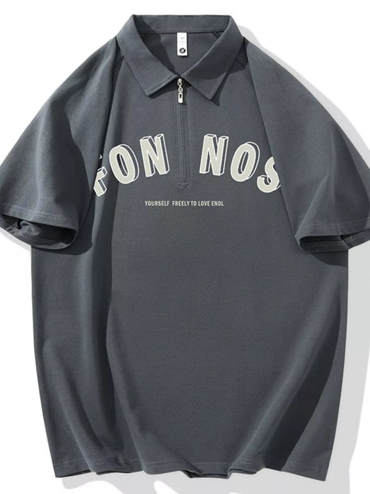 Men's Plus Size Zipper Polo Shirt with Letter Print