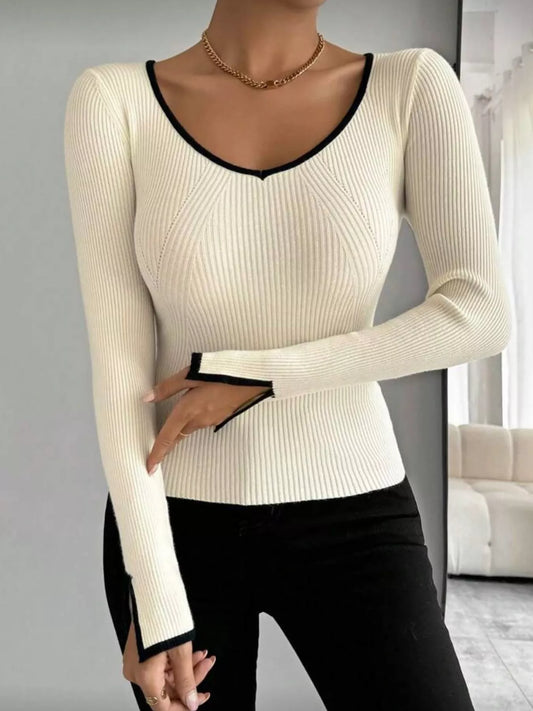 Ribbed Knit Long Sleeve Fake Two-Piece T-Shirt